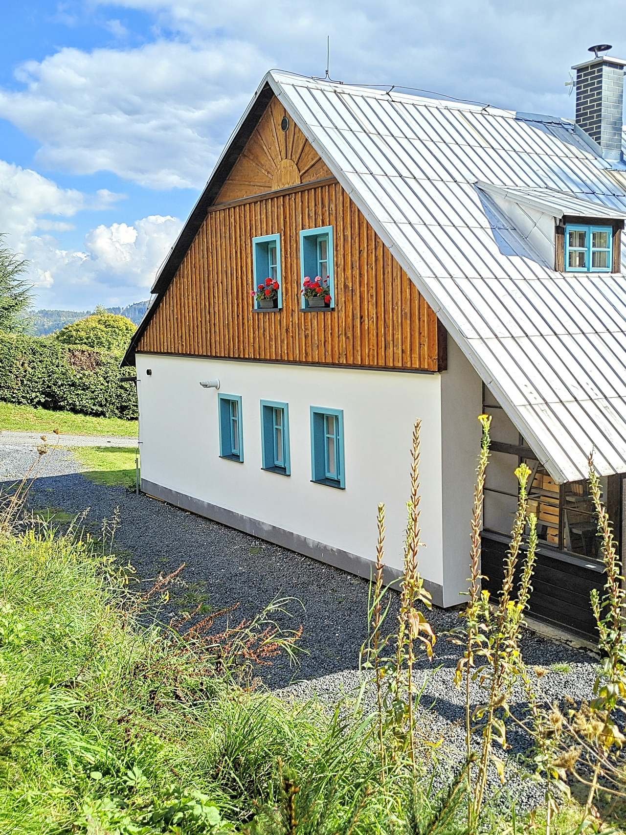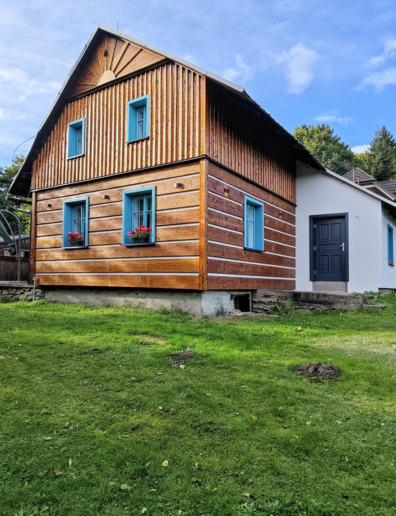 Chalupa se slunným zavlažovaným dvorem, saunou, nové ložnice, nová kuchyně, nová koupelna s vanou, sprchovým koutem, toaletou a bidetem. Druhá toaleta pro hosty. U sauna druhá...